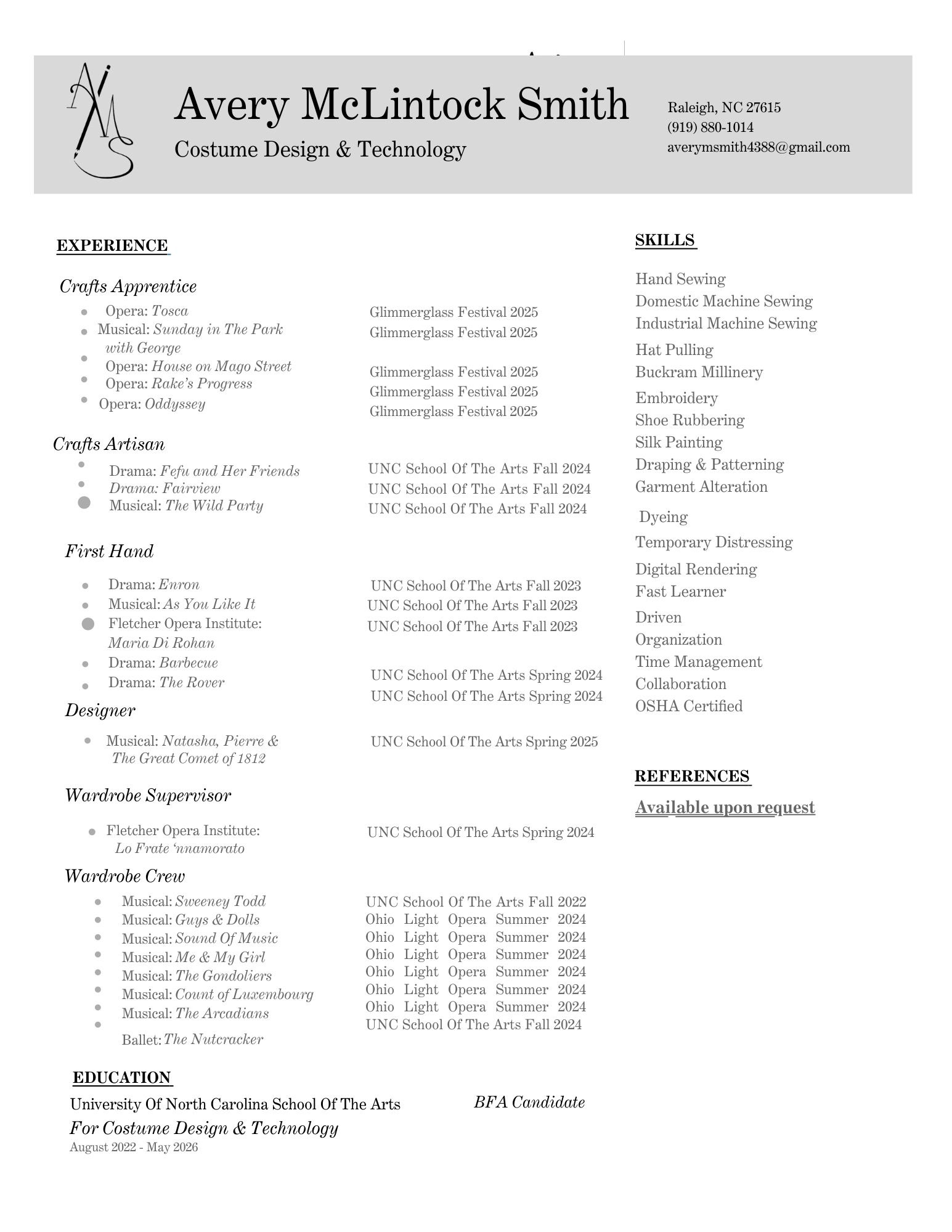 Through my experience creating conceptual designs for "Wicked" and "The Magic Flute", I’ve developed skills in digital painting and traditional mediums such as watercolor, gouache, and marker. In addition to design, I have acquired extensive hands-on experience in costume technology and crafts, collaborating with a team and refining my abilities in sewing, cutting fabric, shoe painting, and shoe rubbering. Every little detail holds gratification for me, especially when I witness a complete ensemble come to life on stage.